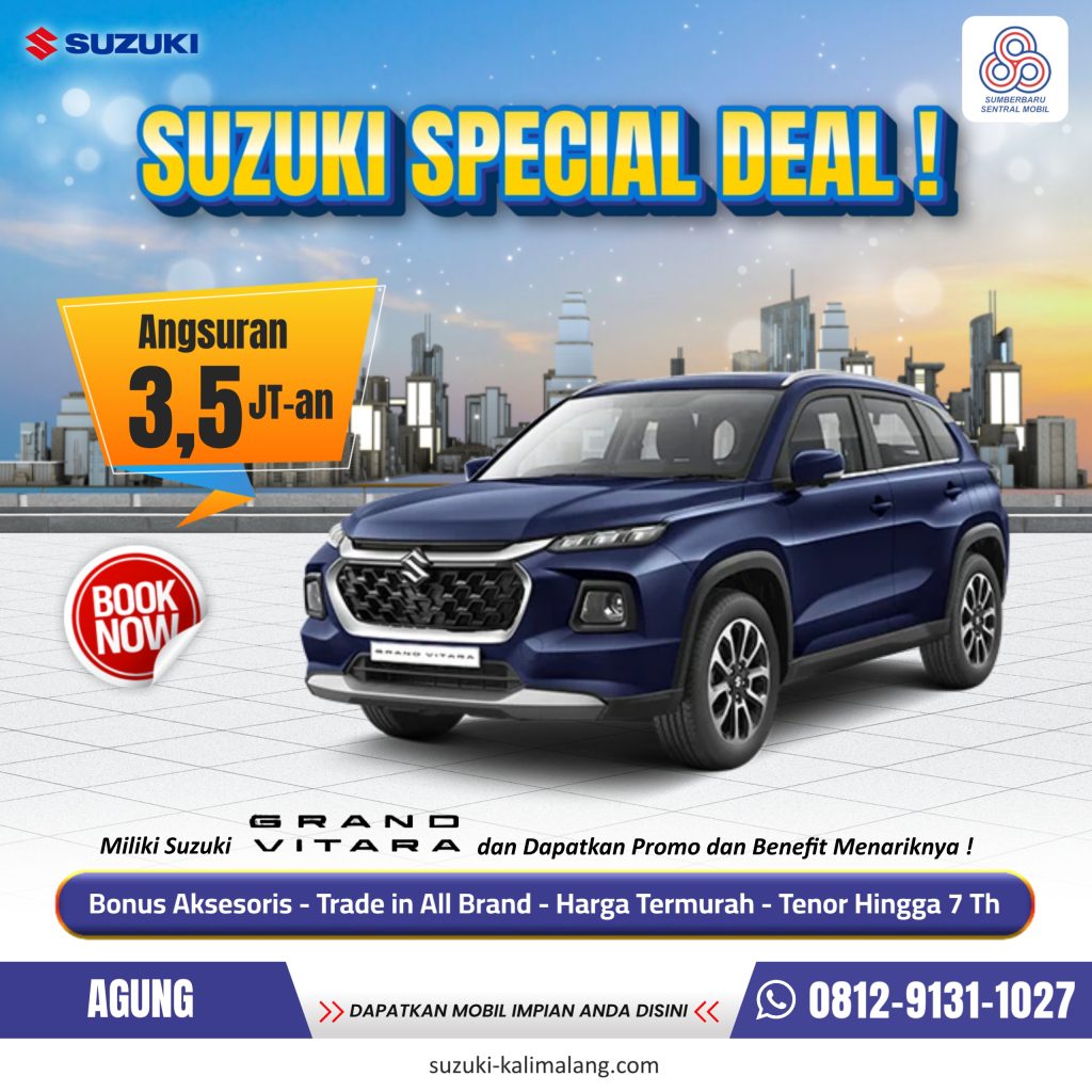Temukan beragam Program Promo, Daftar Harga dan Paket Kredit pembelian mobil Suzuki di tahun 2025 dan segera miliki mobil Suzuki Grand Vitara Impian anda.